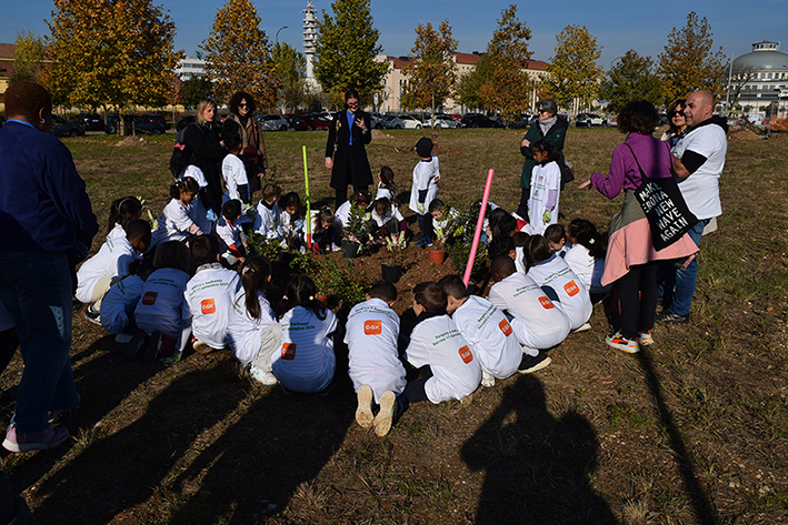 Piantumazione di alberi e arbusti in una grande festa con partner, cittadini, scuole, associazioni e stampa locale.